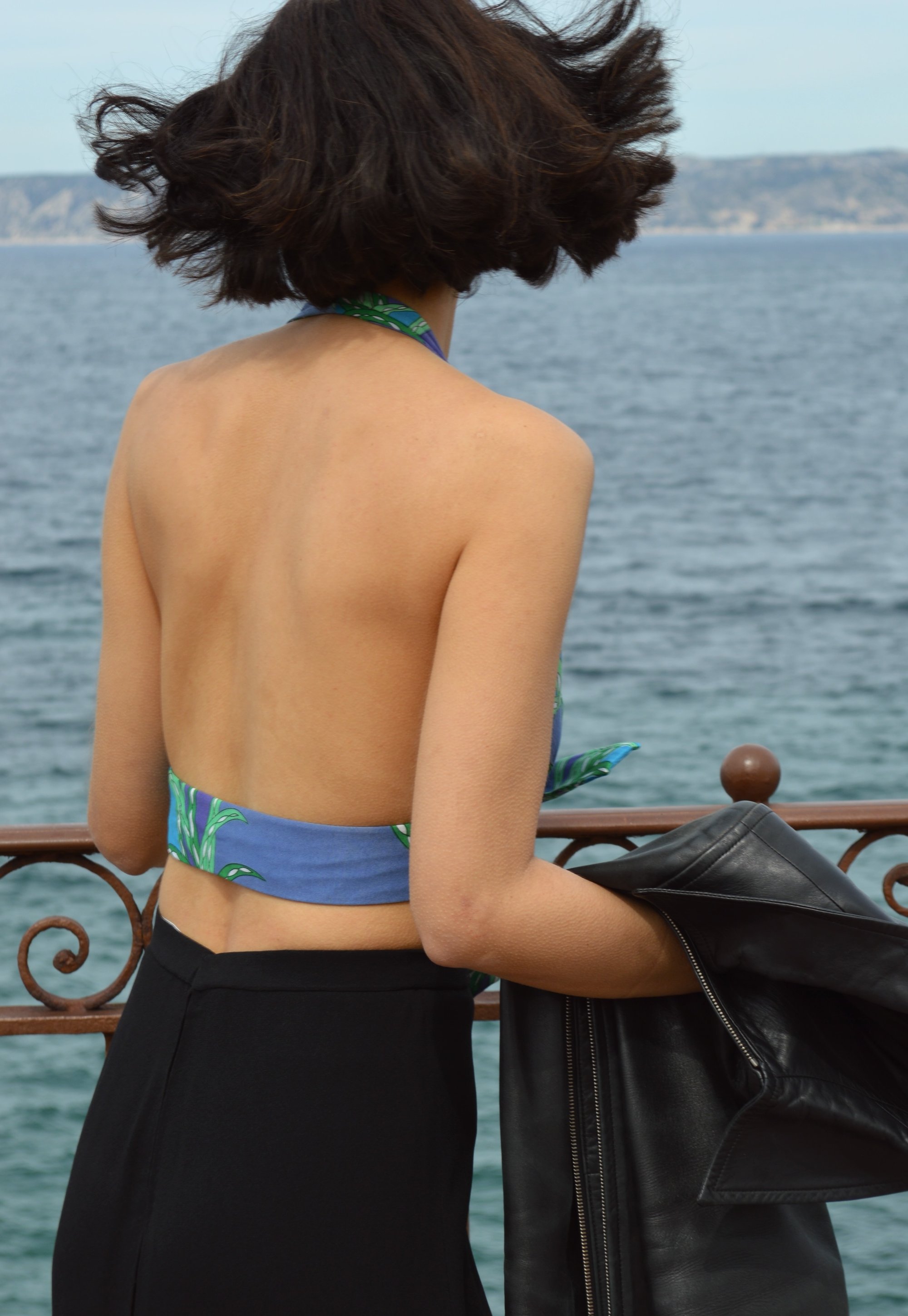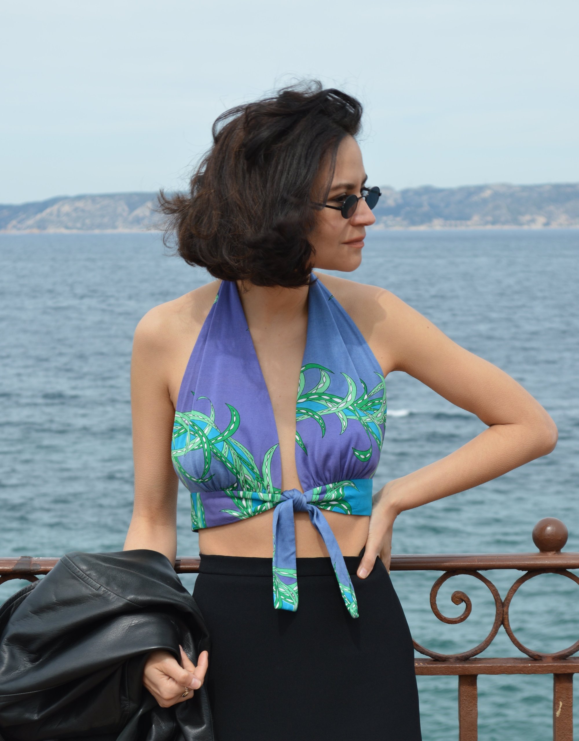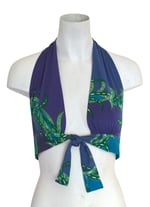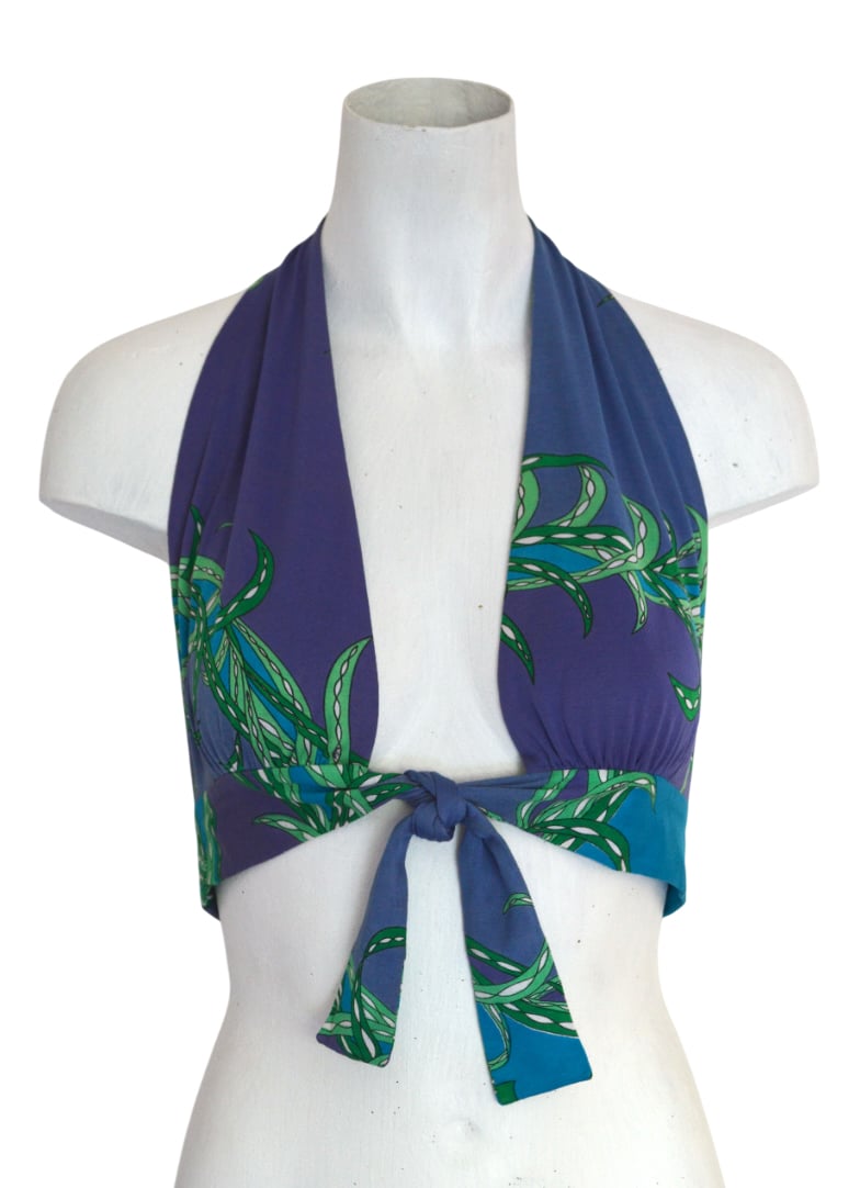 1960s Rare Emilio Pucci halter top in printed cotton. The top is adjustable because it ties at the front. The design leaves the back totally bare except for the single strap across the back and around the neck.