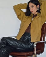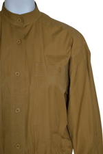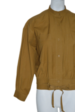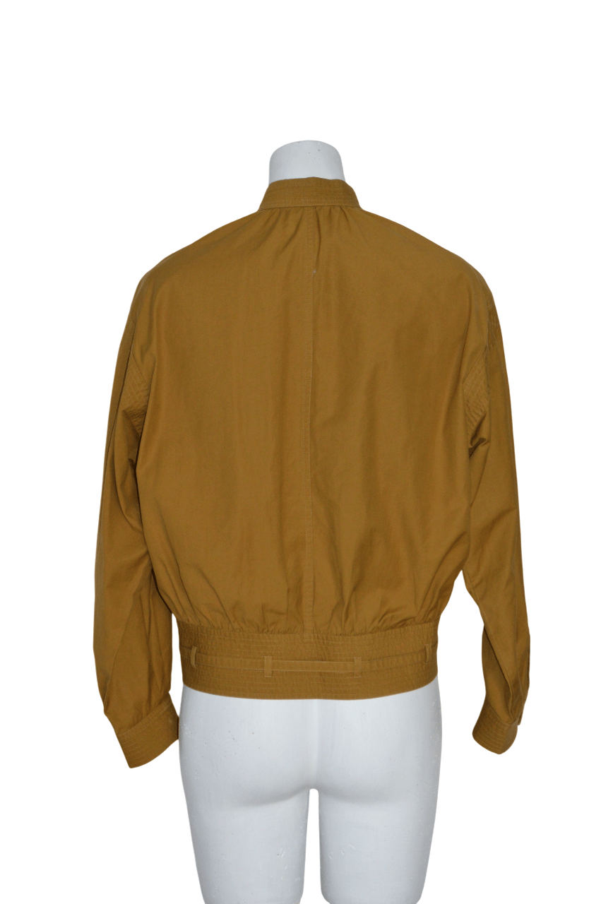 1978 Saint Laurent Rive Gauche bomber jacket, made from unlined mustard cotton, it features a pocket on each side. It fastens at the front with eight buttons and includes an additional button on each cuff. This piece was featured on the runway that same year.