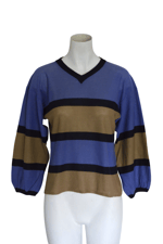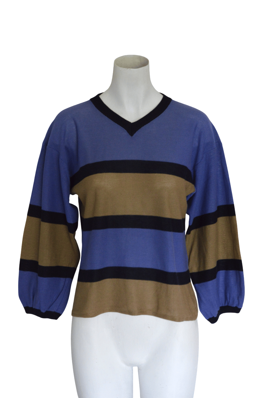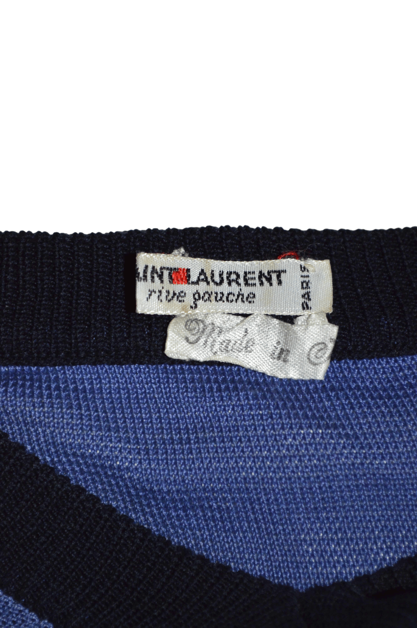1978 Saint Laurent Rive Gauche documented sweater, featuring a V-neckline and a three-color stripe pattern in navy, sky blue, and beige. It has wide sleeves that taper at the cuffs.