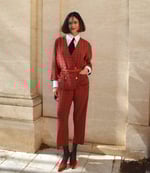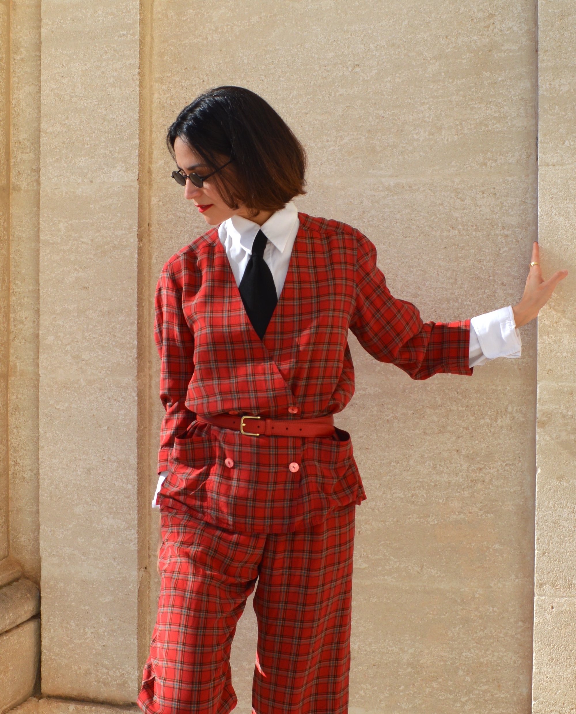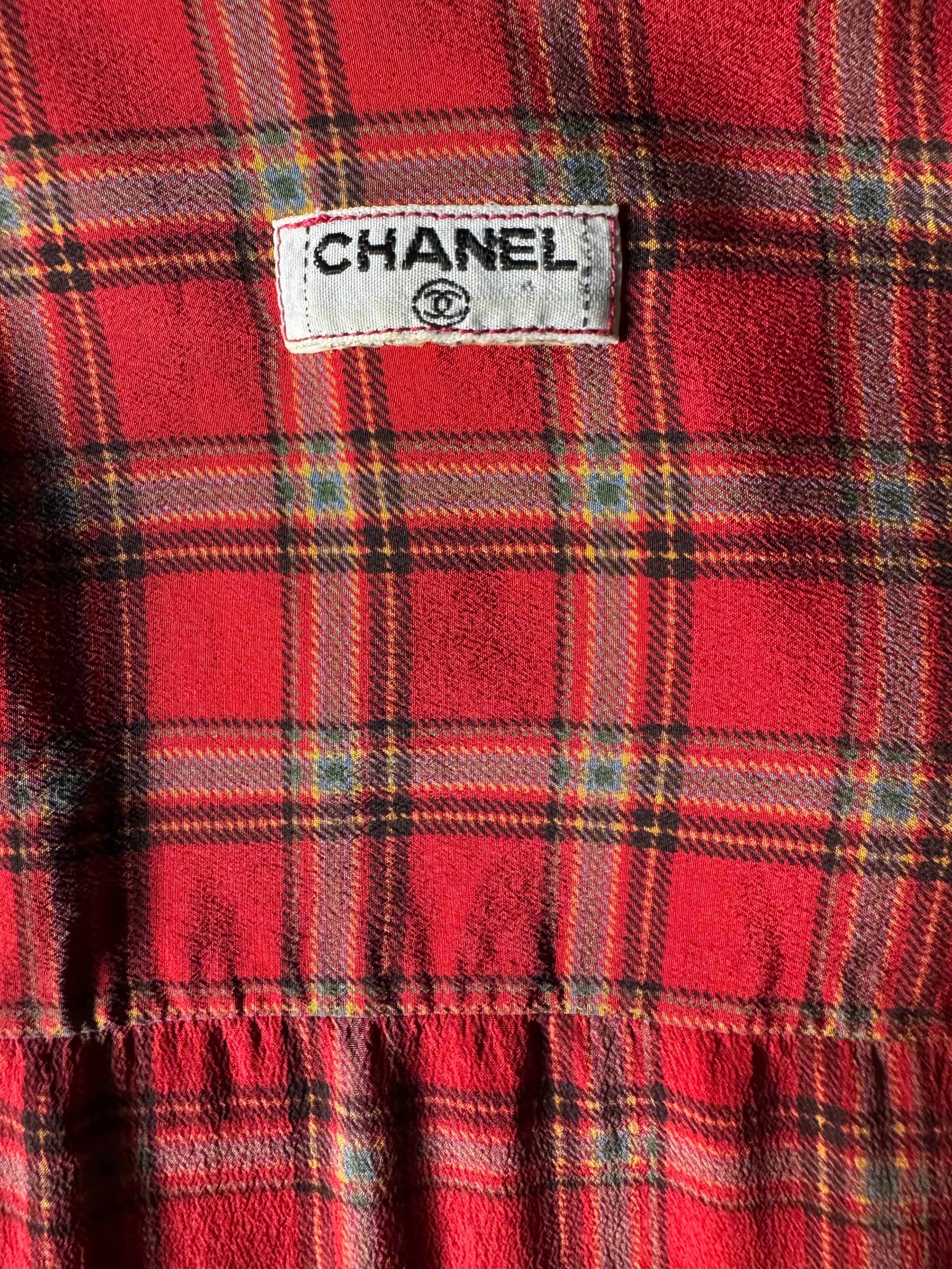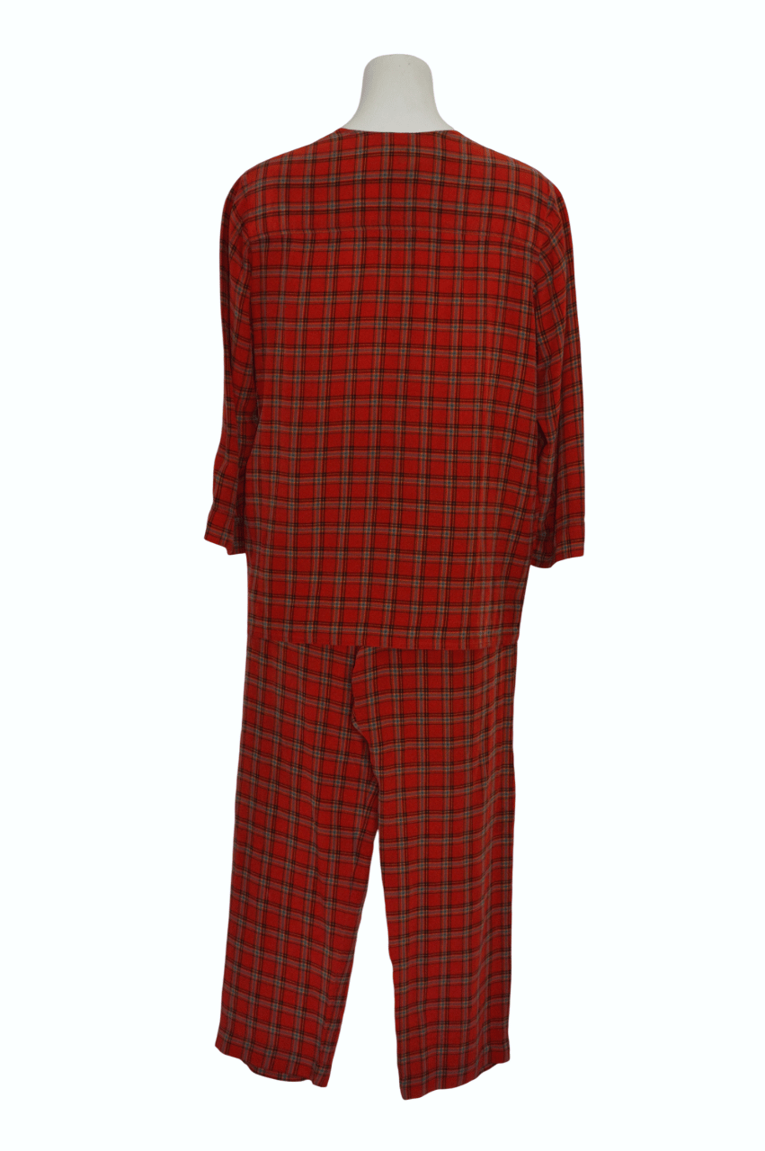 1980s Chanel two-piece set in red tartan silk. It consists of a silk jacket that fastens with four mother-of-pearl CC-logo buttons, and matching trousers with an elasticated waist. A classic Chanel silhouette that can be styled in many ways.