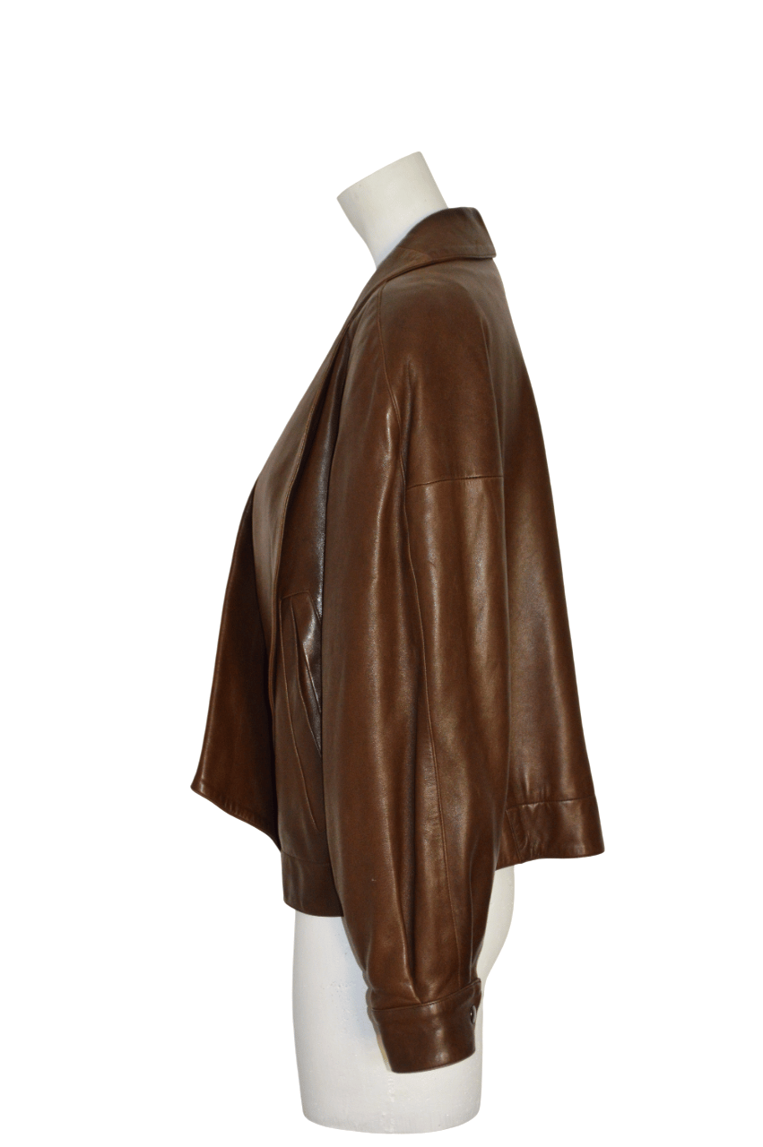 1980s Claude Montana for Idéal Cuir brown leather jacket. Features a shawl collar, raglan sleeves, structured shoulder pads, and two front pockets. It crosses over and fastens at the front with a press button. The back has an interesting volume that creates a beautiful silhouette. The jacket also has a padded lining, making it perfect for winter. This is a unisex piece.