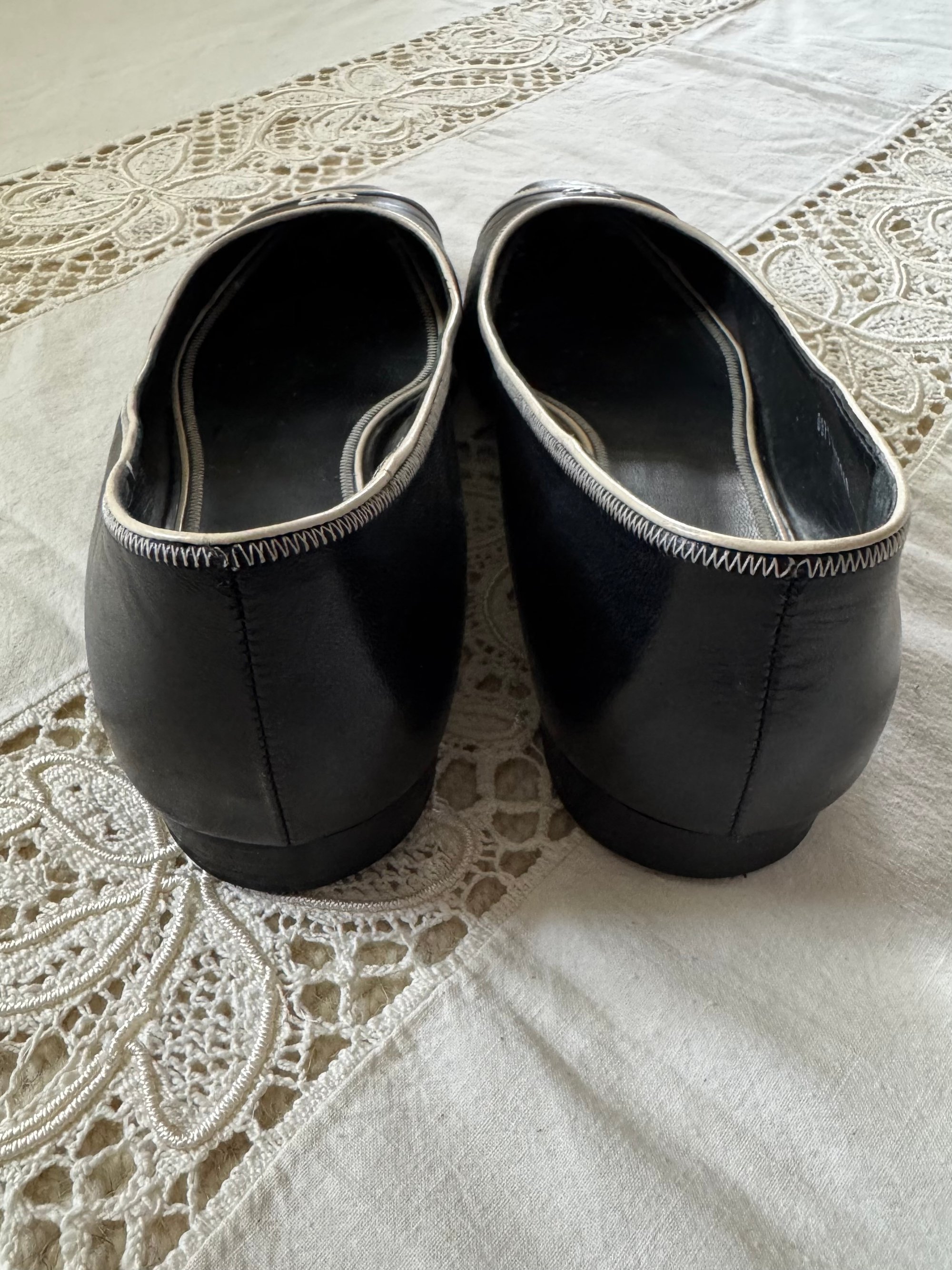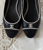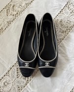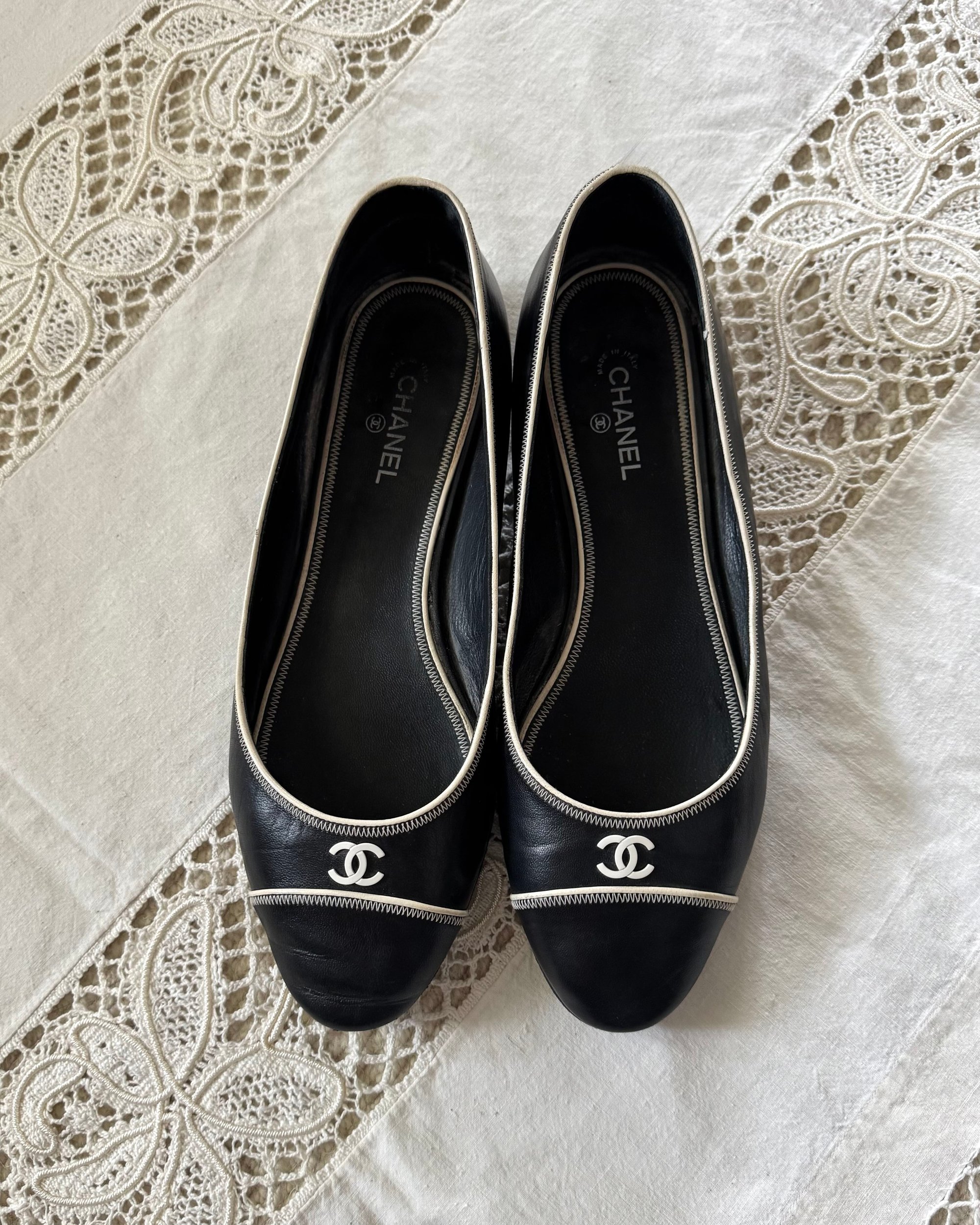 Chanel ballerinas in black leather finished off with a white trim and featuring the signature interlocking Chanel logo in white at the tip.