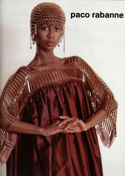 In an era of cultural awakenings, Rabanne explored natural fibers, organic silhouettes and folkloric references. He used techniques such as crochet, embroidery and macrame, combined with cotton.