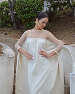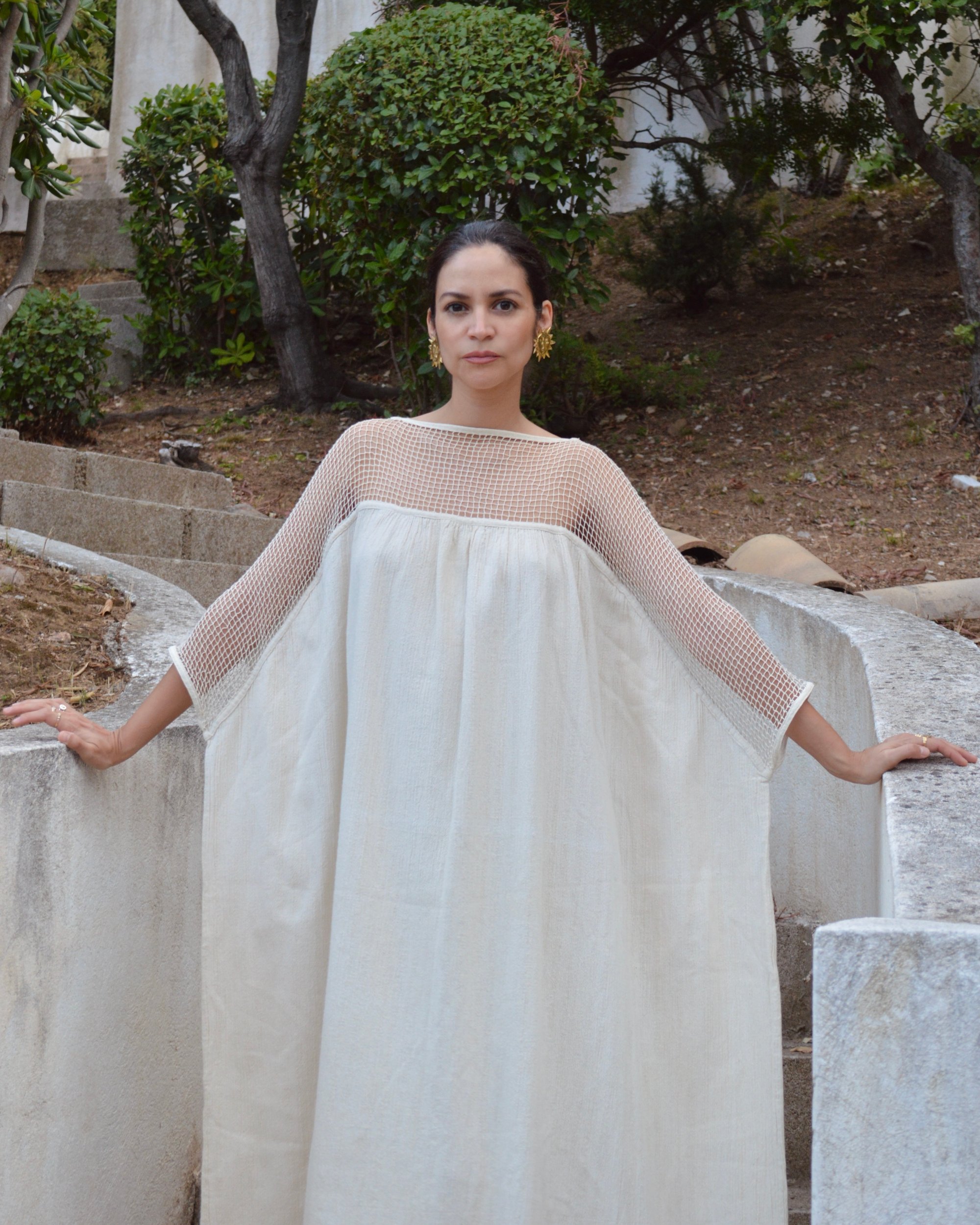 Paco Rabanne couture dress from late 1970. Long dress, almost square shape with stitch mesh in the chest and arms.